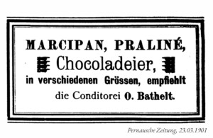Austerlasest Oskar Viktor Rudolf Bathelt (1853 – 1916) on sündinud Bielitzis (Bielsko Poolas) ja peab 1880. aastast kondiitriäri Rüütli tänaval. Abielus on ta Kuressaarest pärit Marie Awikuga, kes ettevõtliku naisena peab pudukauplust alul Rüütli tn 32 ja alates 1894. aastast oma majas Rüütli 26. Oma poes müüb ta vihmavarje, sukki, kindaid ja meestele kaelasidemeid, jalutuskeppe ning kübaraid. Lisaks pakub supelvõõrastele supelkostüüme ja rannavarje ning ühtlasi kirjastab Pärnu vaadetega postkaarte.