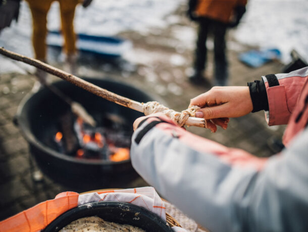 Tikkupullan leipominen ja nuotiolla paistaminen Klaara-Mannin Lomakeskuksessa.
