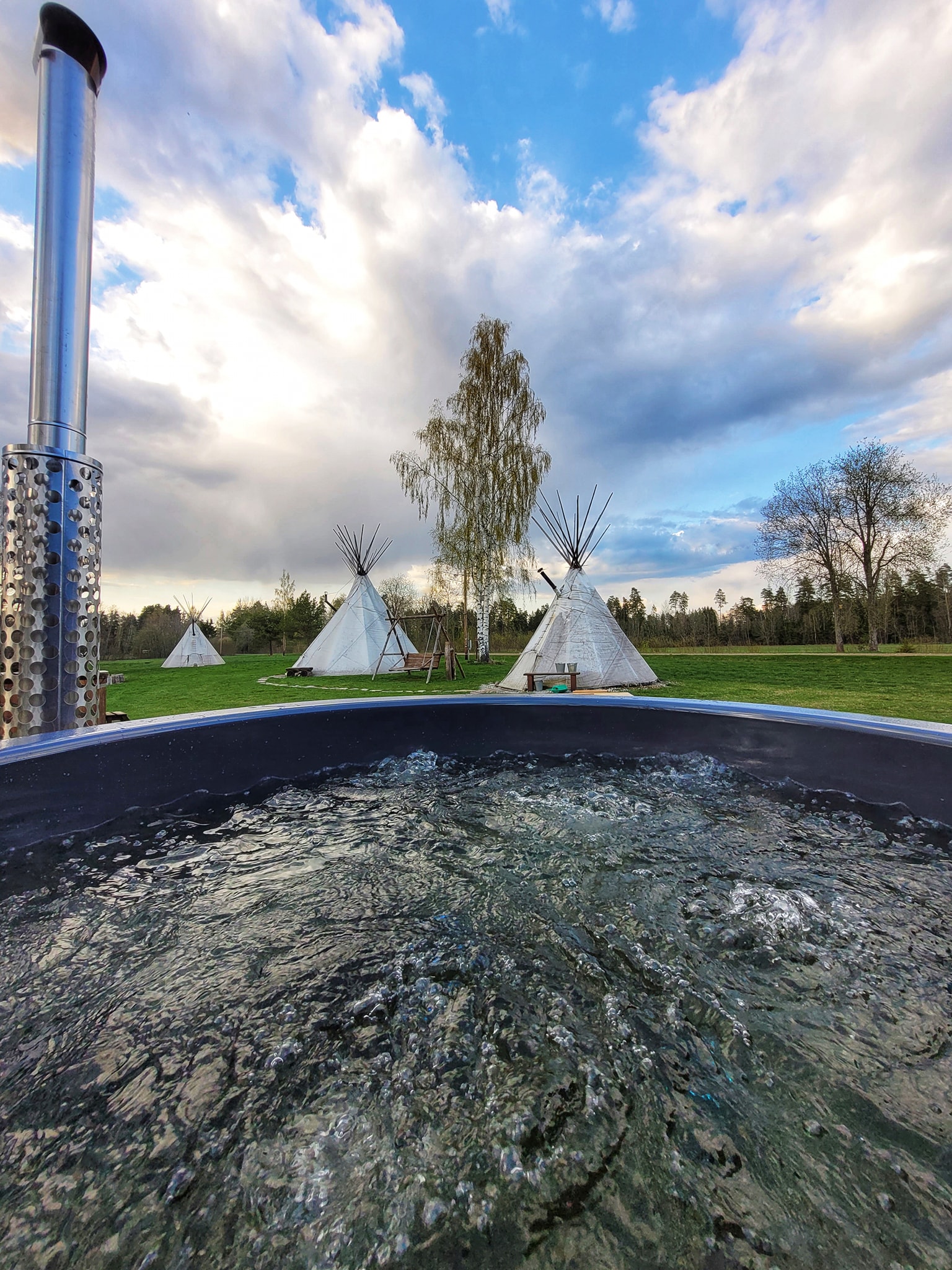 Jõe Puhketalu kümblustünn asub kaunis ja rahulikus kohas, tiigi kaldal, kus saate nautida looduse vaikust ja imelisi vaateid. Kümblustünni asukoht terrassil, kõrgel tiigi kaldal, pakub täiuslikku keskkonda lõõgastumiseks – olgu siis tähtede all, täiskuu või päikeseloojangul, isegi vihmasabina saatel.