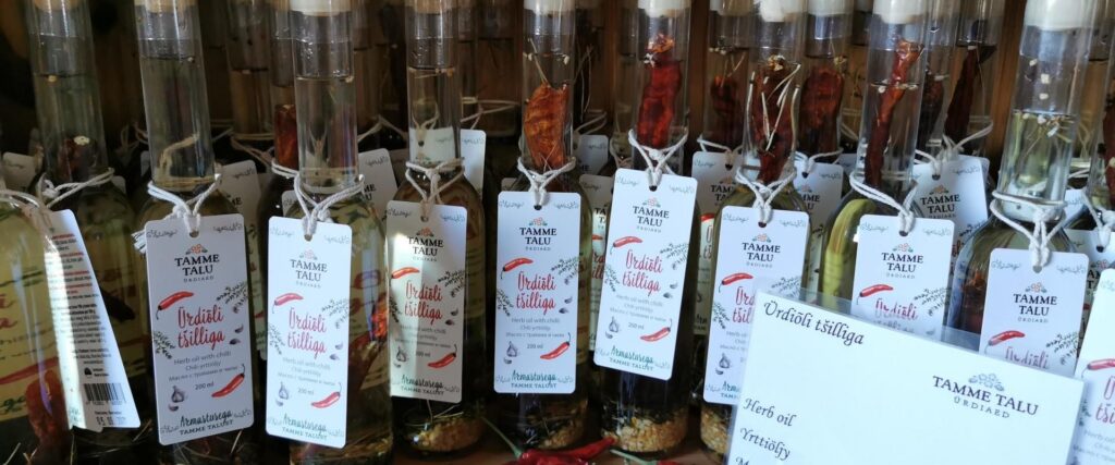 The herb garden shop at Tamme Farm sells a variety of hot, sweet, tasty, and delicious products which are made from herbs, chilli peppers, berries, and vegetables grown and processed at Tamme Farm.The selection includes tea mixes, flavoured salts and spice mixes, spicy and gourmet jams, and herb oils.