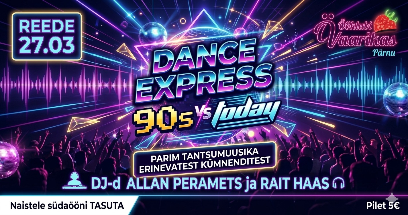 đ„ MĂ€rtsikuu viimasel reedel kutsub "Vaarikas" kĂ”iki tantsumuusika sĂ”pru taas kĂŒlla, sest majas on eriĂŒritus "Dance Express - 90s vs today".