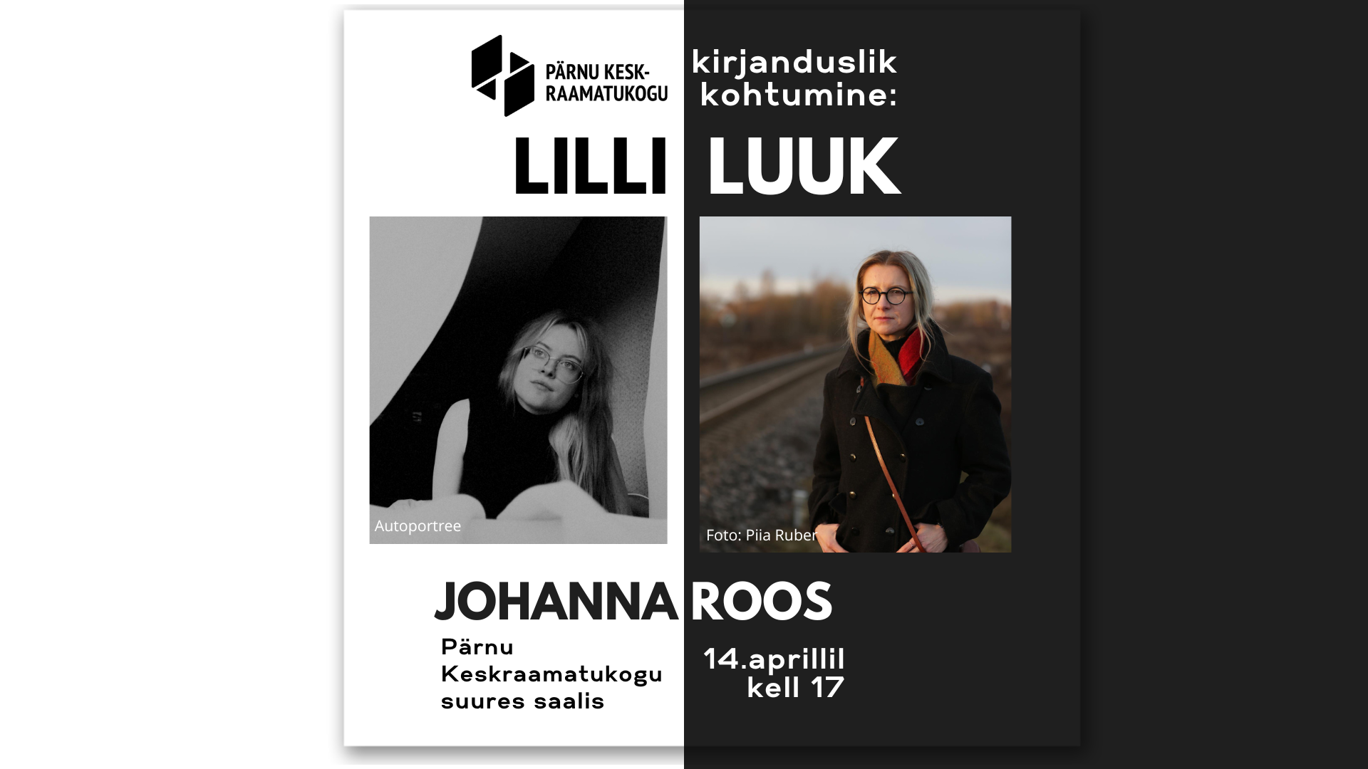 14. aprillil kell 17 kohtuvad Pärnu Keskraamatukogu suures saalis kirjandushuvilistega kirjanikud Lilli Luuk ja Johanna Roos.