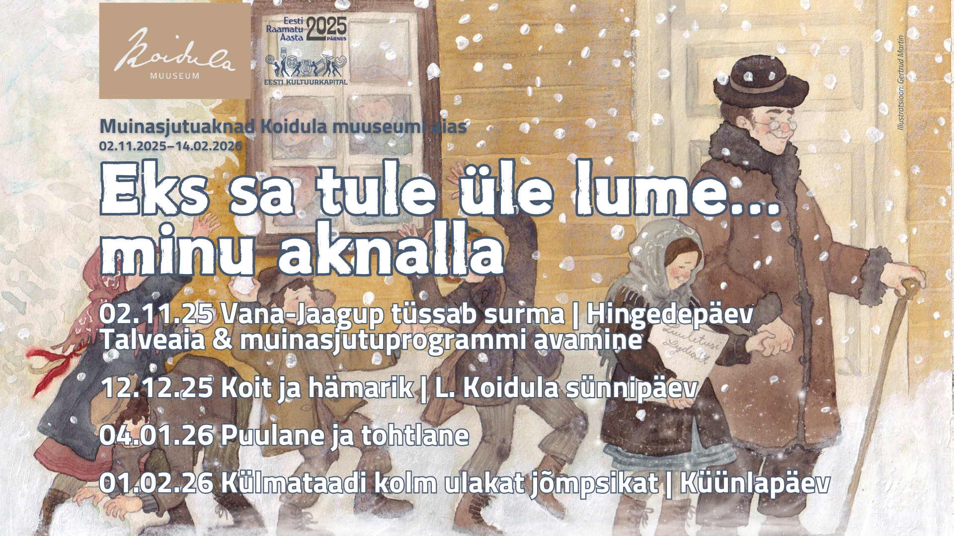 - Pühapäeval, 2.11.2025, hingedepäeval, talveaia ning sarja avamine muinasjutuga “Vana-Jaagup tüssab surma”