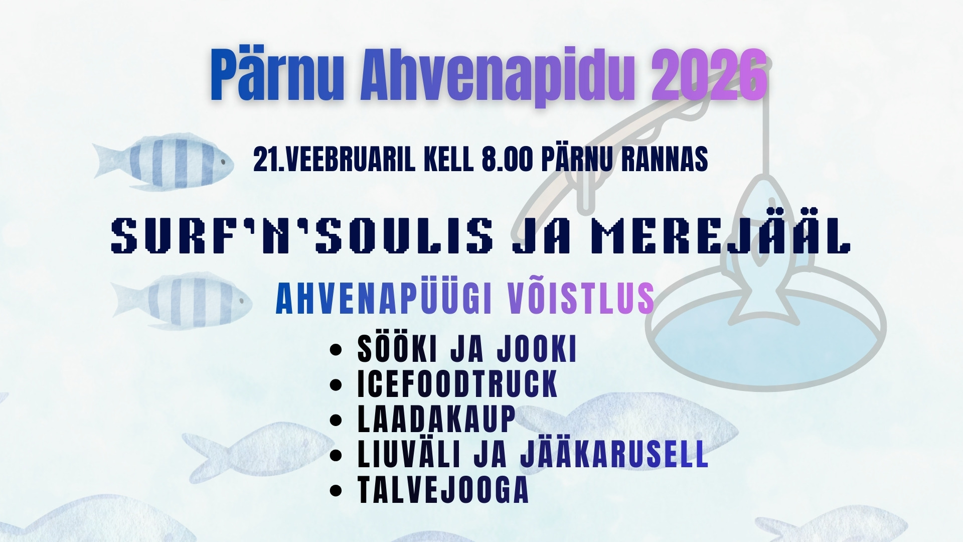 Pärnu ahvenapidu on meie talvine sündmus, et tähistada seda aegade tahaulatuvat talvist kalapüügi traditsiooni, nautida loodust, väärtustada talve ja koosolemist. Sel aastal pidu toimub Surf`n Soulis kohapeal rannas ja merejääl. Toimub tradistiooniline ahvenapüügivõistlus, kuhu on oodatud kõik. Saab süüa ja juua ja kohal on Eesti esimene Icefoodtrack. Avatud on liuväli, jääkarusell ja müüakse laadakaupa landist suitsukalani. Lõkkel saab grillida vahukomme. Võistlusele registreerimine algab kell 8.00.