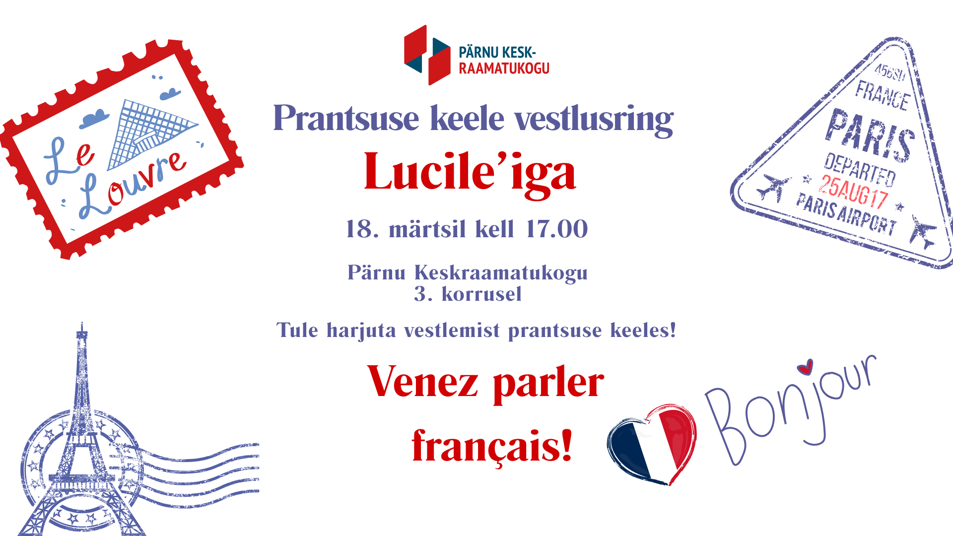 18. märtsil saab Pärnu Keskraamatukogu 3. korrusel taas harjutada prantsuse keelt koos seda emakeelena kõneleja(te)ga.