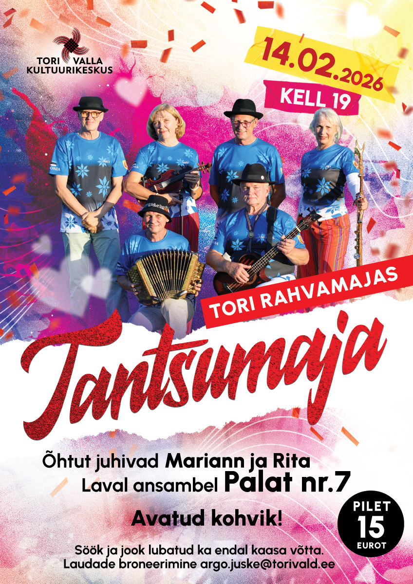 💃 TANTSUMAJA TORI RAHVAMAJAS! 💃 14. veebruaril ootame kõiki Tori Rahvamajja, et tähistada sõbrapäeva ühe korraliku tantsuõhtuga! Sündmusele annab hoo sisse ja hoiab tuju üleval ansambel Palat nr.7! 🎶 Õhtut juhivad säravad Mariann ja Rita. ✨ Mida on vaja teada? 📅 Millal: 14. veebruaril kell 19.00 📍 Kus: Tori Rahvamajas 🎫 Pilet: 15 eurot ☕ Avatud on kohvik, kuid meelepärase söögi ja joogi võib ka ise kaasa võtta! 👉 Broneeri laud varakult: kirjuta argo.juske@torivald.ee ja taga endale ja oma seltskonnale parim koht! Tule üksi, kaaslasega või terve sõpruskonnaga – tantsupõrandal näeme! 🌹