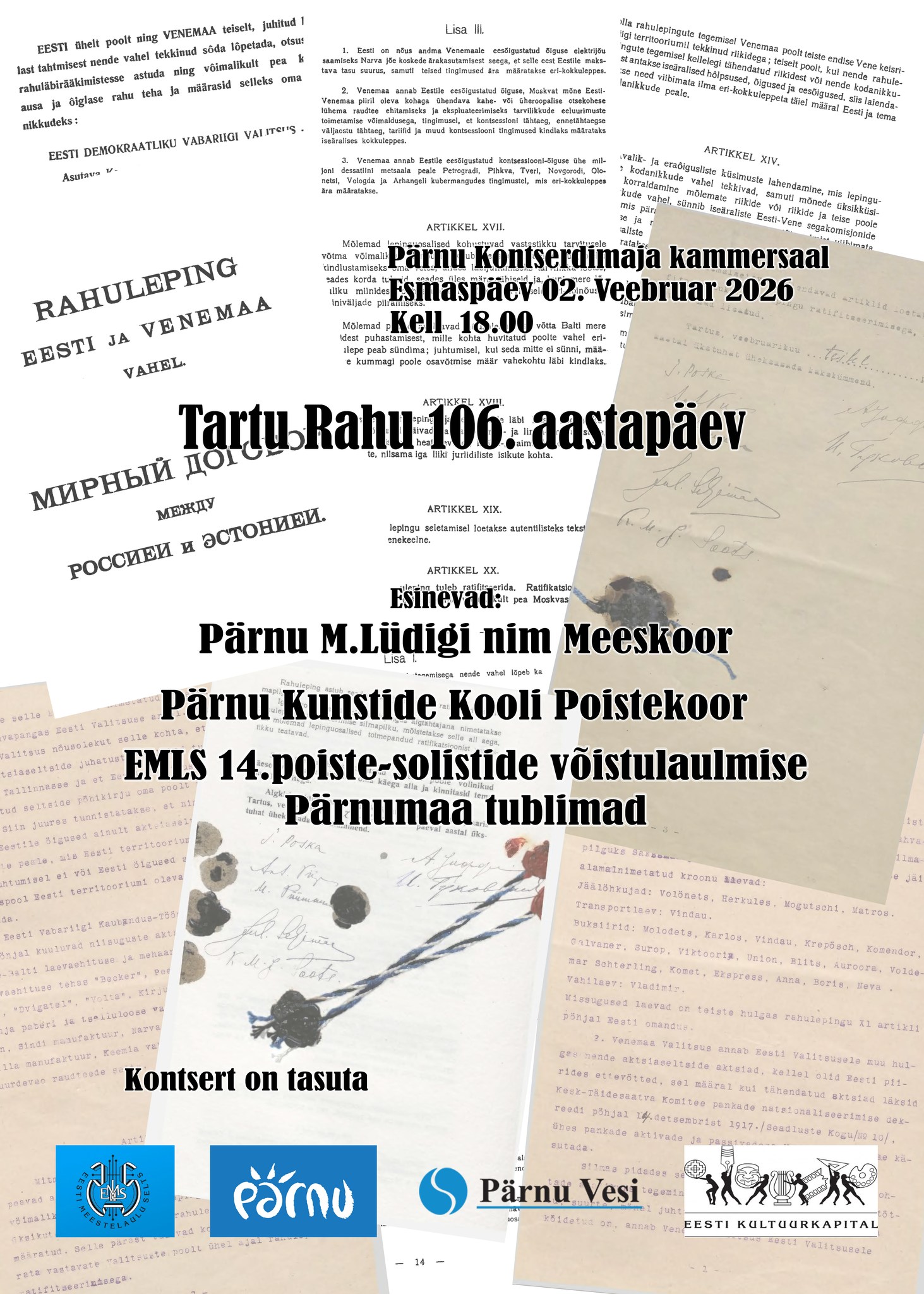 Kell 18 toimub Tartu rahulepingu aastapäevale pühendatud kontsert Pärnu kontserdimaja kammersaalis. Esinevad Mihkel Lüdigi nimeline meeskoor, Kunstide Kooli poistekoor ja Eesti Meestelaulu Seltsi 14. poiste-solistide võistulaulmise Pärnumaa tublimad.