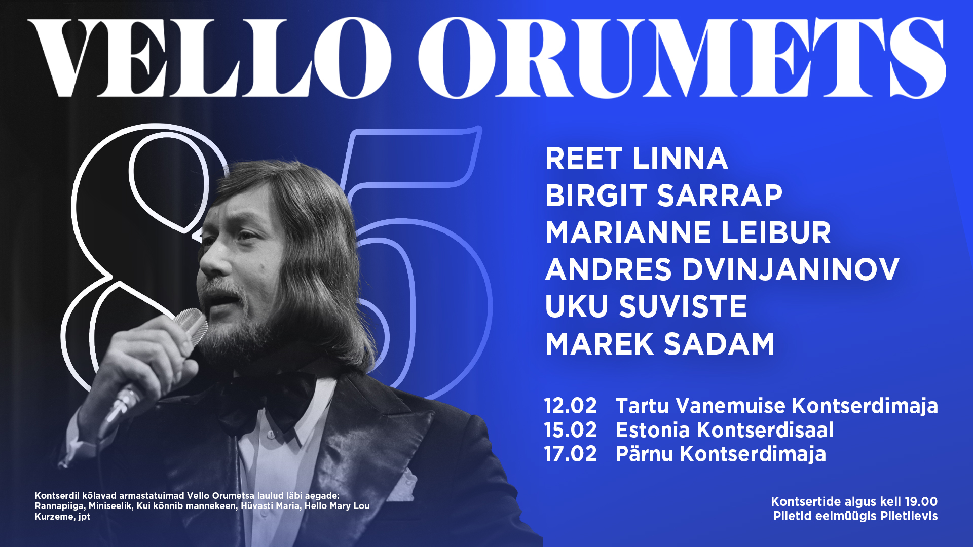 Need õhtud on kummardus suurele meistrile. On naeru ja ka pisarat silmanurgas. Me ei püüa Vellot matkida, parodeerida. Saame kokku ja esitame neid tuntud ning tundmatuid laule ning tähistame Vello elu väärikalt.